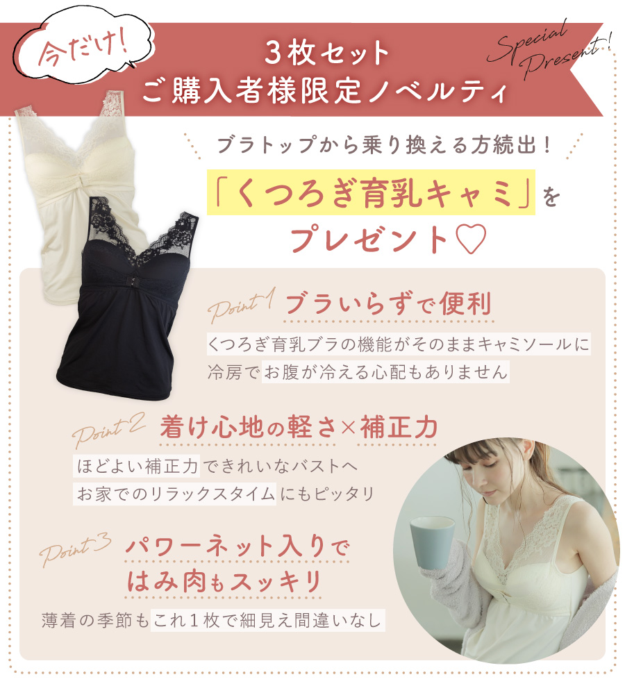 さらに、3枚セット購入で「くつろぎ育乳キャミ」のプレゼント&「10日間のサイズ交換保証」が付いてくる!
